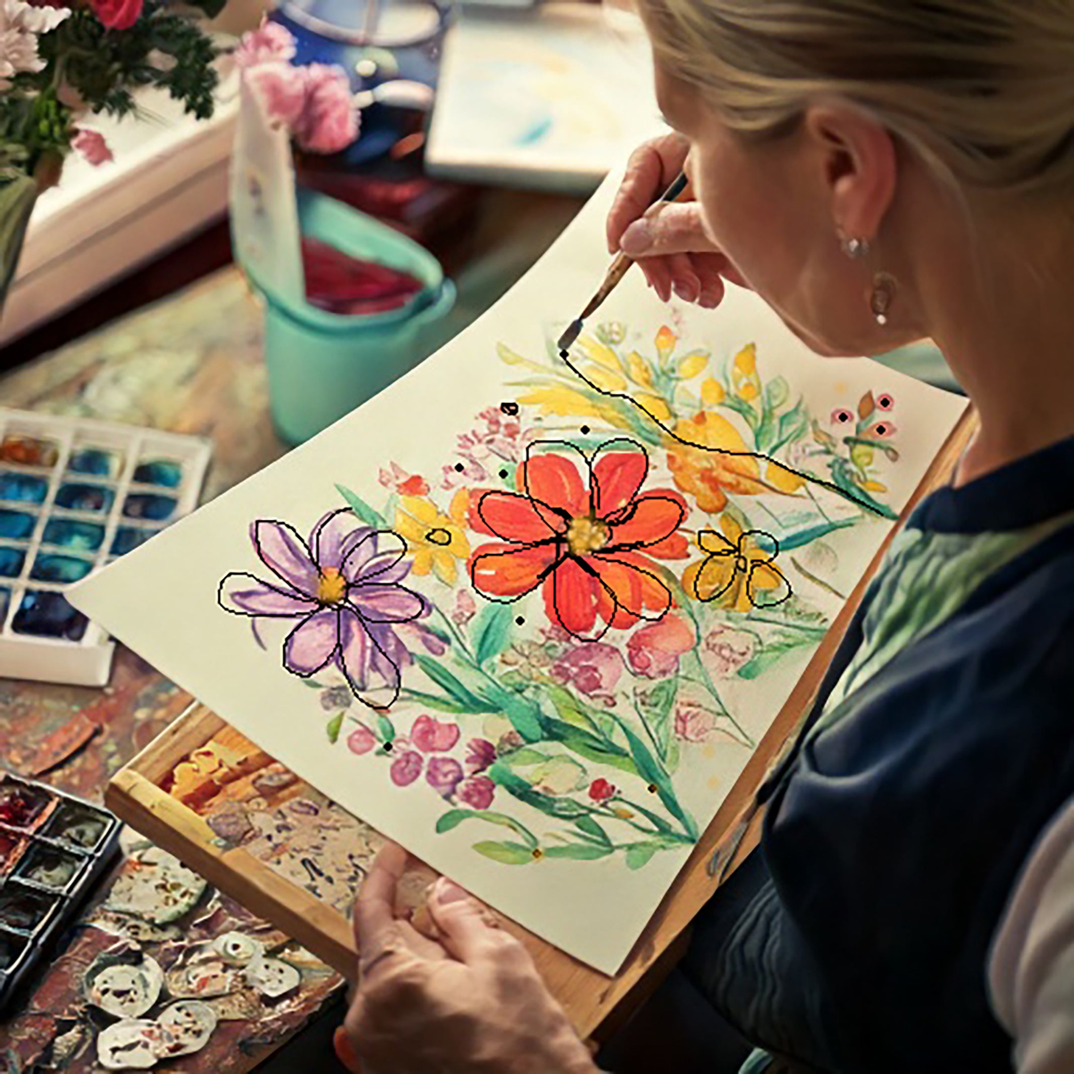 As an artist, I’m drawn to both natural elements and geometric forms—especially round shapes and whimsically rendered flowers that appear throughout my compositions. My work explores spaces where playfulness and contemplation coexist.
